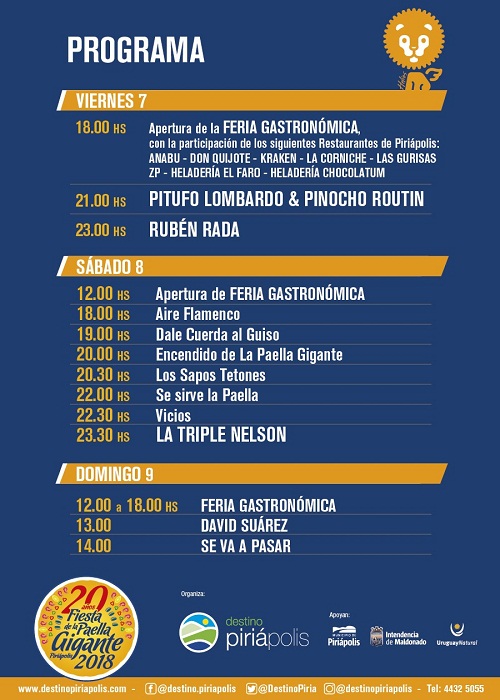 Este año Piriápolis celebra los 20 años de la Fiesta de la Paella Gigante. Por lo tanto, los organizadores decidieron extender los festejos a tres días: viernes 7, sábado 8 y domingo 9 de diciembre.