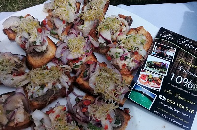 Durante el lanzamiento, gastrónomos de diferentes restaurantes de Rocha, representando a balnearios y localidades del departamento, invitaron con exquisitos bocados, platos y tragos típicos, elaborados con productos tradicionales de la cocina local, que ha alcanzado un notable nivel. Podemos mencionar al infaltable el “arroz a la India Muerta” del Rotary Lascano,las exquisitas paellas de mariscos y de verduras, elaboradas por Proa de Barra de Valizas y La Moza de Santa Teresa; las almejas Palmares, cocinadas por Jorge Simeone, de Don Rómulo de La Pedrera; las propuestas del restaurante Il Tano Cucina y de Cero Stress de Punta del Diablo; focaccias y empanadas de La Focaccia de La Paloma; los quesos y pescados ahumados de Valizas; los dulces de Merce Daglio, entre otros. Sin dejar de lado la cerveza artesanal, los jugos y licores de frutos nativos, donde reina el butiá.