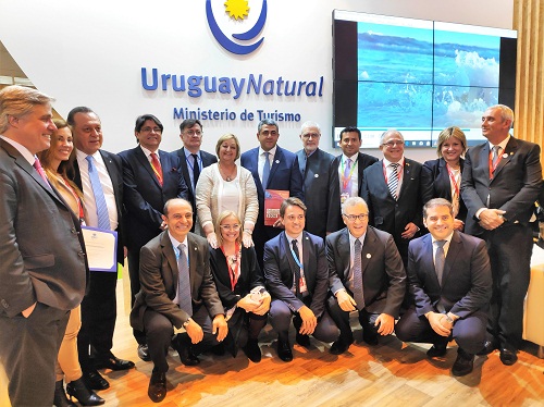 En el stand de Uruguay en FITUR: autoridades del MINTUR, OMT, FEDESUD, de Argentina, Embajador de Uruguay, representantes de direcciones de Turismo y del Punta del Este Convention Bureau