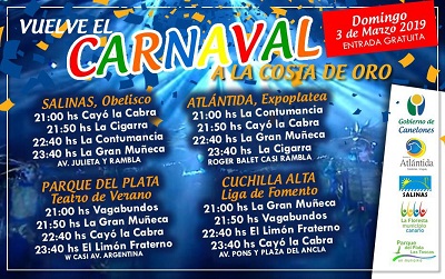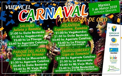 Del domingo 3 al martes 5 de marzo, el Carnaval vuelve a la Costa de Oro en los escenarios de Salinas, Atlántida, Parque del Plata, Costa Azul, Cuchilla Alta y Jaureguiberry.