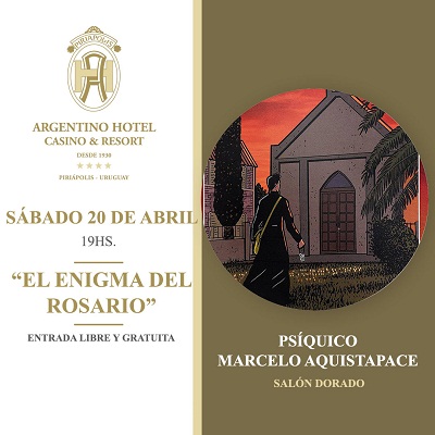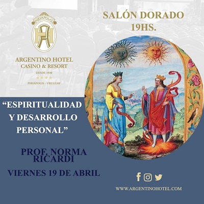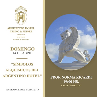 Domingo 14 de abril -Hora 19 - Símbolos alquímicos del Argentino Hotel - Prof. Norma Ricardi **- Don Francisco Piria dejó una amplia gama de señales místicas en Piriápolis. Sus edificios más emblemáticos encierran mensajes cifrados y códigos esotéricos como es el caso en particular del Argentino Hotel . Los invitamos a conocer este fascinante mundo oculto y secreto.