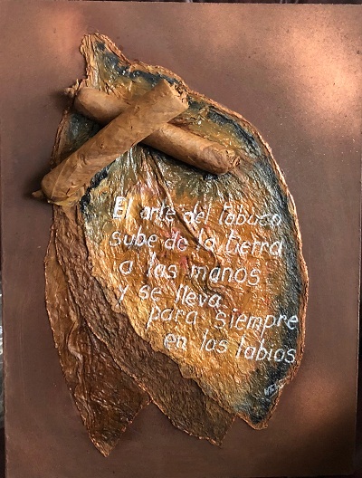 La historia con las hojas de tabaco comienza cuando viajaron a la isla por tercera vez (2011) “Estábamos de visita en el Morro de San Carlos de la Cabaña, donde hay una fortaleza de la época colonial española que servía para custodiar la bahía”. “Entré a una tienda de Tabacos que había ganado el record Guinnes con el Habano más grande del mundo, y como me interesaba tener una hoja de tabaco, me presenté como maestro de escuela de Uruguay y el hombre me regaló dos. En ese momento tenía un 6to. Año y trabajé con este material mucho”.
