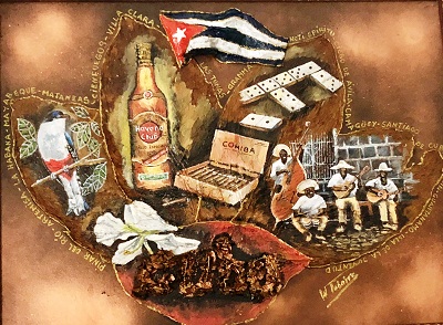 Con el material nuevo hice un “cocotaxi” (trirodado con cuerpo esférico de fibra de vidrio que tiene forma similar a un coco y es servicio de taxi); una partida de dominó porque son apasionados del juego, e incorporé tradiciones que ellos tienen. En otro viaje de 2016 marcharon las fotos para la isla con Evangelina, sobrina de mi señora, quien de vuelta me trajo enormes hojas de tabaco en las que plasmé el conjunto de las “Tradiciones de Cuba”. Con el resto del material hizo “Cuba es Revolución” y pintó sobre ella a sus protagonistas.