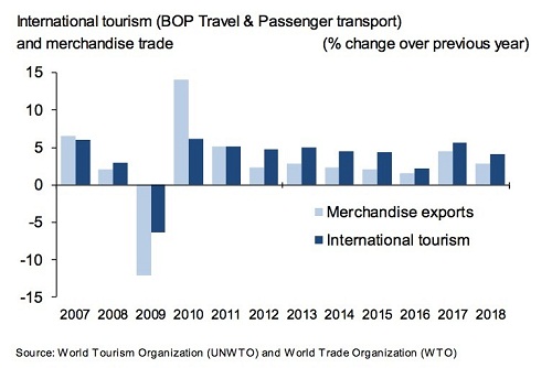 De acuerdo con un reciente informe de la Organización Mundial del Turismo (OMT), las exportaciones generadas por el turismo internacional alcanzaron los 1,7 billones de dólares de los EE. UU. en 2018, un incremento del 4 % en términos reales con respecto al año anterior.
