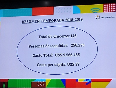 Sosa explicó que durante la temporada 2018/19 arribaron al puerto de Montevideo 89 buques, mientras que a la bahía de Maldonado, lo hicieron 57, lo que representa un 4,3% más que en el periodo pasado. Entre ambas ciudades, desembarcaron un total de 256.225 personas, 55% en la capital y 45% en Punta del Este, lo que significa un 5,7% más que en la temporada anterior, con un gasto de U$S 9.556.485, identificando un gasto per cápita de U$S 37.Si se considera edad y sexo, 6 de cada 10 de las personas que descienden de los barcos en la capital son mujeres; 70% son personas mayores de 45 años.