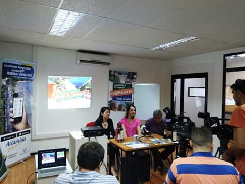 La directora de Desarrollo Turístico, Ximena Acosta, y la funcionaria Mariana Barboza, junto con el alcalde de Atlántida, Gustavo González, realizaron conferencias de prensa acompañados por las autoridades de turismo de los departamentos litoraleños.