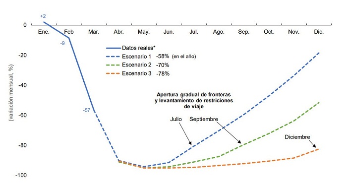 Escenario 1 (-58%) basado en la apertura gradual de las fronteras internacionales y la relajación de las restricciones de viaje a principios de julio