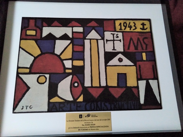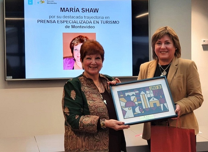 Elizabeth Villalba, DT de la Int. de Montevideo, entrega su reconocimiento a María Shaw, por su destacada trayectoria en prensa Especializada en Turismo