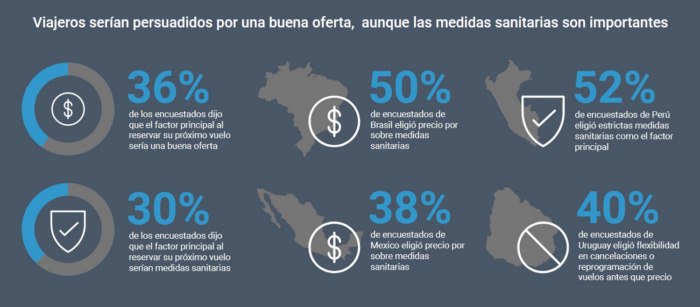 Entre los encuestados, el 36% señalo que el factor más importante al reservar su próximo vuelo sería una buena oferta o precio competitivo. Al mismo tiempo, un 30% indicó que serían estrictas medidas sanitarias, y un 28% le dió mayor importancia las políticas flexibles en cancelaciones o reprogramación de vuelos.