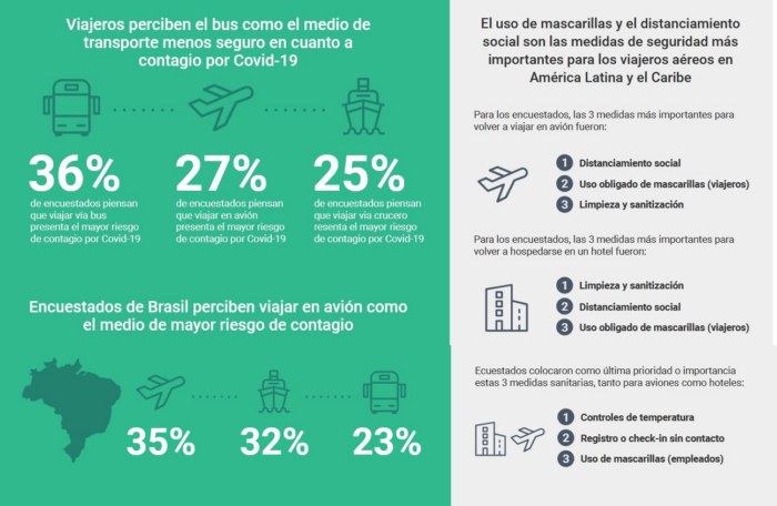 Los encuestados de Brasil indicaron que viajar en avión presenta el más alto riesgo de contagio (35%), seguido de cerca por un 32% que opina que el medio de transporte de mayor riesgo es viajar en crucero, y 23% opina que es el bus.