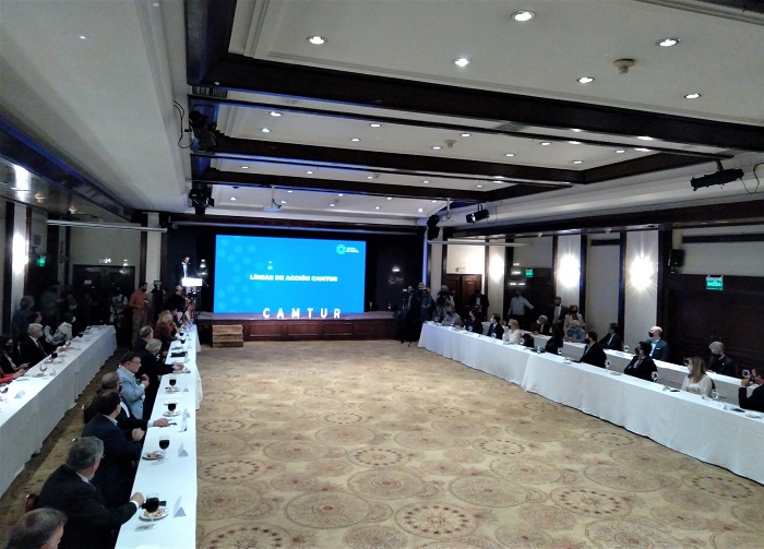 En la Sala de Conferencias del cuatro piso del Radisson Montevideo Victoria Plaza Hotel, al caer la noche del lunes 30 de noviembre, se había reunido gran parte de los referentes del sector, convocador por la CAMTUR. Pero este encuentro estuvo llena de sorpresas, ya que no sólo por primera vez un presidente de la República en ejercicio asistió a una reunión de la gremial que agrupa a los privados del sector turístico, sino que estaban presentes las principales autoridades del Ministerio de Turismo: Germán Cardoso, Remo Monzeglio, Ignacio Curbelo y Martín Pérez Banchero; el ministro de Trabajo y Seguridad Social, Pablo Mieres;el subsecretario del Interior, Guillermo Maciel; la representante de los privados en el BPS, varios directores departamentales de Turismo, los presidentes de las gremiales que integran la Cámara, representantes de gremiales sectoriales, expresidente, directivos de las organizaciones de gestión de destinos, socios de la CAMTU y periodistas, entre otros.
