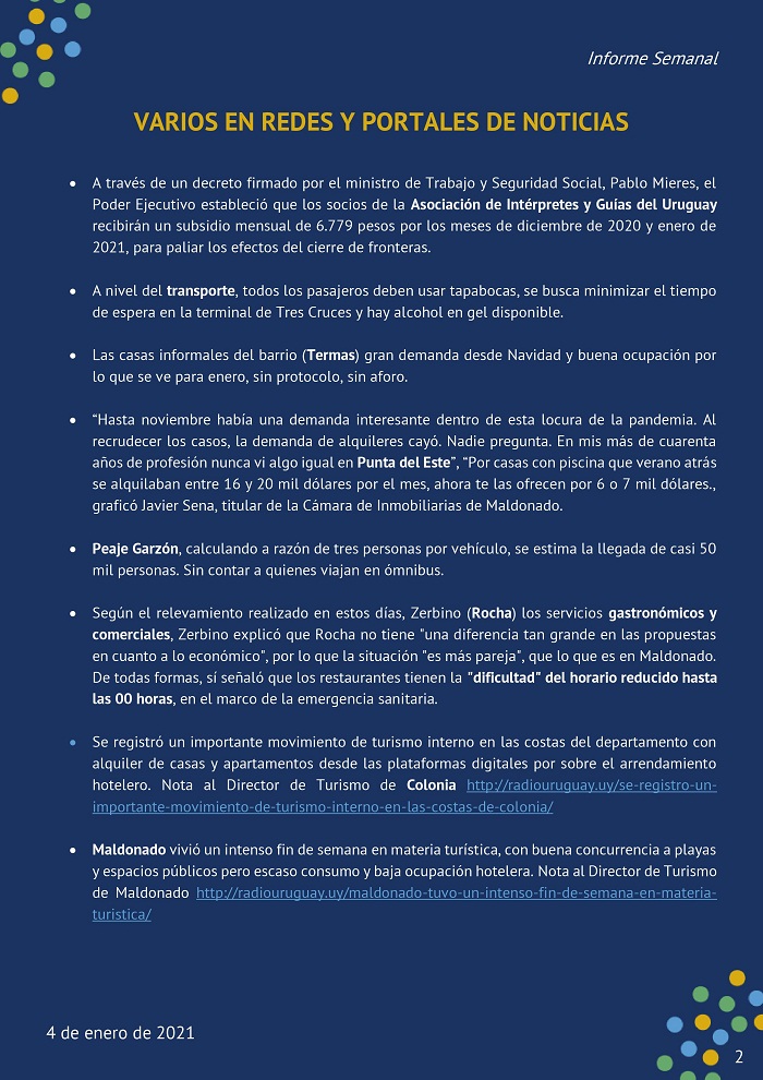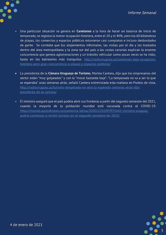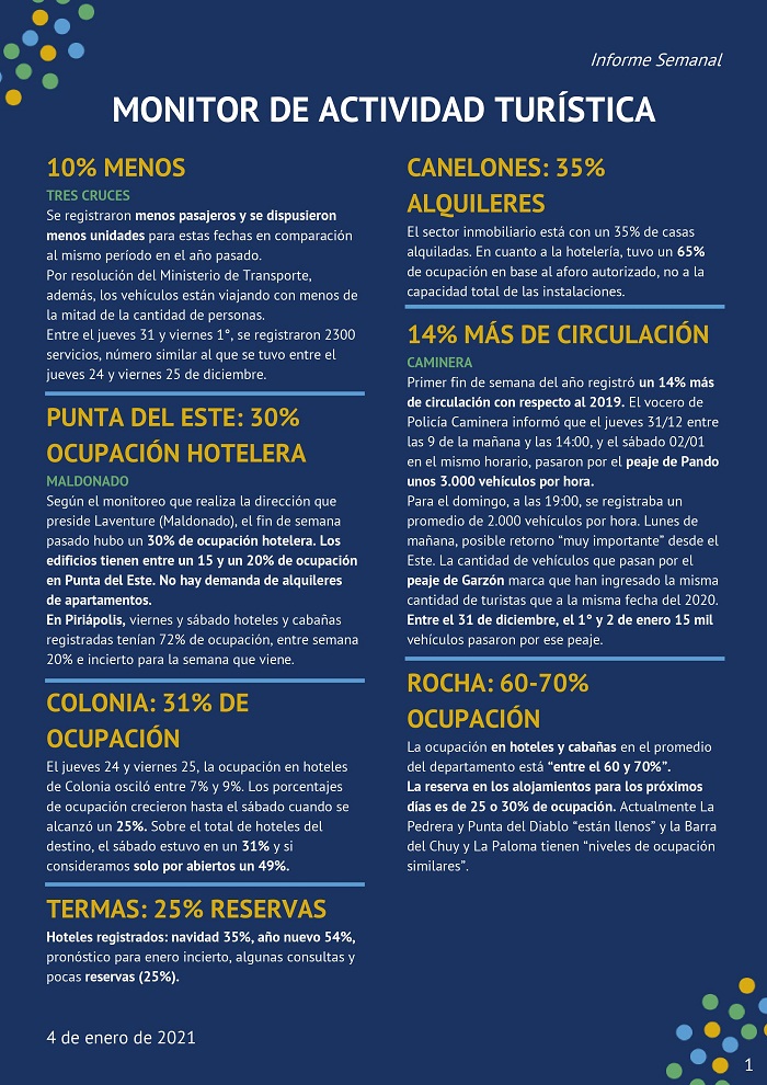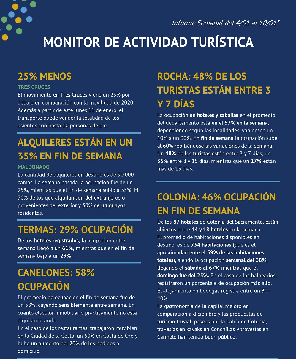 Ahora, la gremial que reúne a los privados del sector, ha emitido un documento muy valioso, con información de la actividad turística en todo el país. El primero, del 4 de enero, ya está publicado la web de la CAMTUR. Los mismos se irán actualizando semana a semana.
