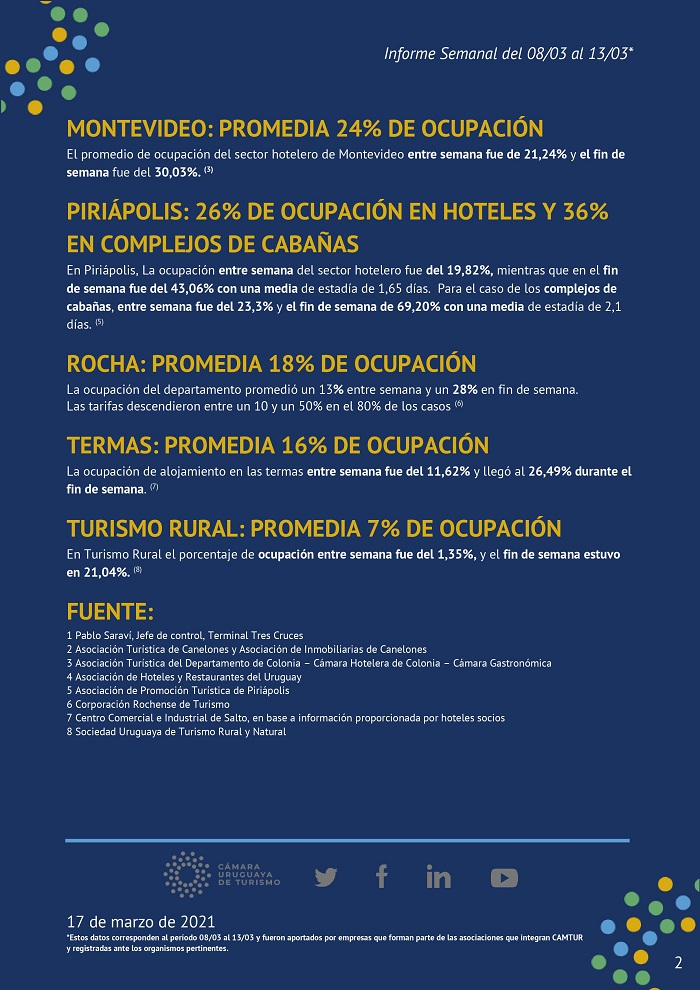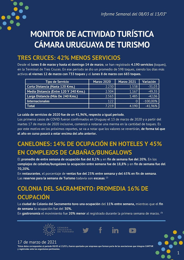Aunque comenzó el año lectivo, marzo se caracteriza por el buen clima y aprovechamiento del cierre del verano para vacacionar. La Cámara Uruguya de Turismo, CAMTUR, presentó una vez más el monitor de la actividad tursística en Terminal Tres Cruces, Canelones, Colonia, Montevideo, Piriápolis, Rocha, Termas y Turismo rural.