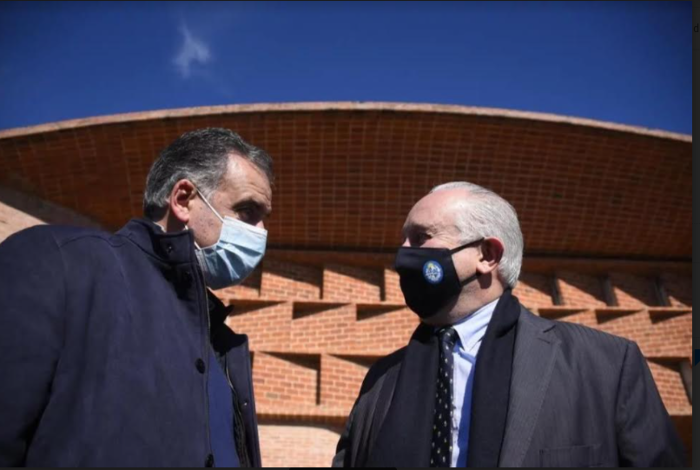 En la celebración oficial: el intendente de Canelones Yamandú Orsi y el Ministro de Educación y Cultura, Pablo da Silveira. (Foto de Camilo dos Santos, de El Observador)