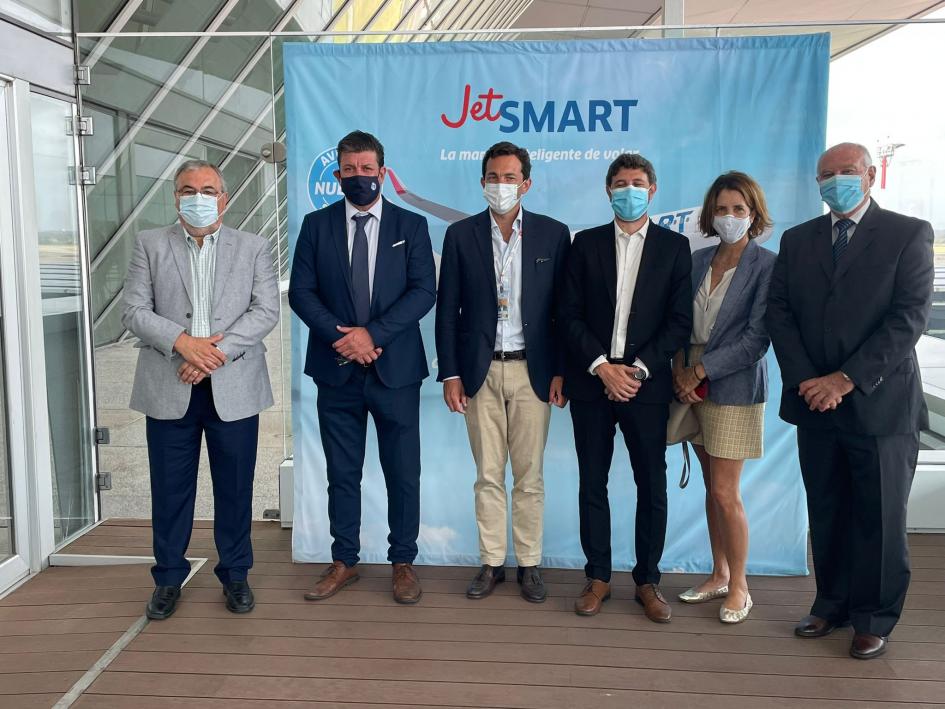 Francisco Rodriguez, VP de la CAMTUR; Ignacio Curbelo, director general del MINTUR; Diego Arrosa, CEO de Corporación América Uruguay; Darío Ratinoff, gerente comercial de JetSmart para Uruguay; Ines Bonicelli, vice directora ejecutiva de Uruguay XXI; Daniel Olmedo, director general de Transporte Aéreo