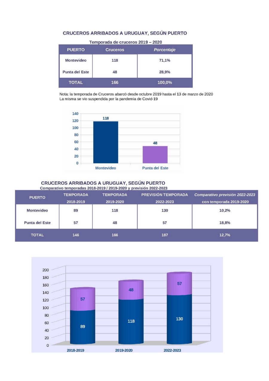 En el cuadro al pie de esta nota, se puede observar que, en comparación a la última temporada antes de la pandemia (2019-2020), está previsto que esta temporada lleguen 10,2 % más de cruceros a Montevideo y 18,8% más a Punta del Este.
