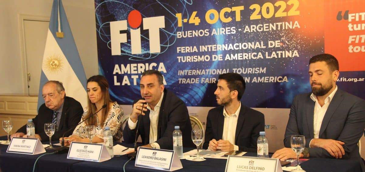 Lanzamiento de FIT 2022: Gustavo Hani, presidente de la FIT, acompañado por Yanina Martínez, Secretaria de Promoción Turística de la Nación; Mario Ijelman, VP de FIT y Pte. de AVIABUE; Leandro Balasini, Subsecretario de Relaciones Institucionales y Cooperación Internacional del Ministerio de Turismo y Deportes; Lucas Delfino, presidente del Ente de Turismo del Gobierno de la Ciudad de Buenos Aires; así como de representantes de la CAT y de FAEVYT.