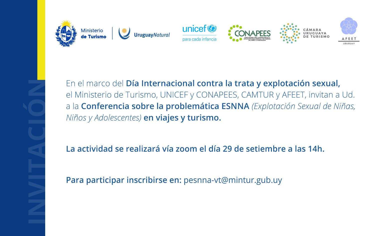 La actividad se llevó a cabo el jueves 29 de septiembre, vía Zoom, organizada por el Ministerio de Turismo, UNICEF, el Comité Nacional para la Erradicación de la Explotación Sexual Comercial de Niños, Niñas y Adolescencia (CONAPEES), INAU, la Cámara Uruguaya de Turismo y AFEET, la Asociación de Ejecutivas de Empresas Turísticas de Uruguay.