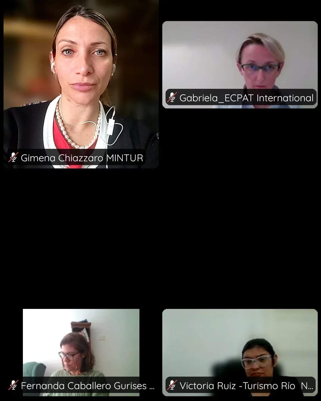 Algunas de las participantes por plataforma: Gimena Chiazzaro, de MINTUR, Gabriela Kühn, de ECPAT; Fernanda Caballero, de Gurises Unidos; Victoria Ruíz, de Río Negro