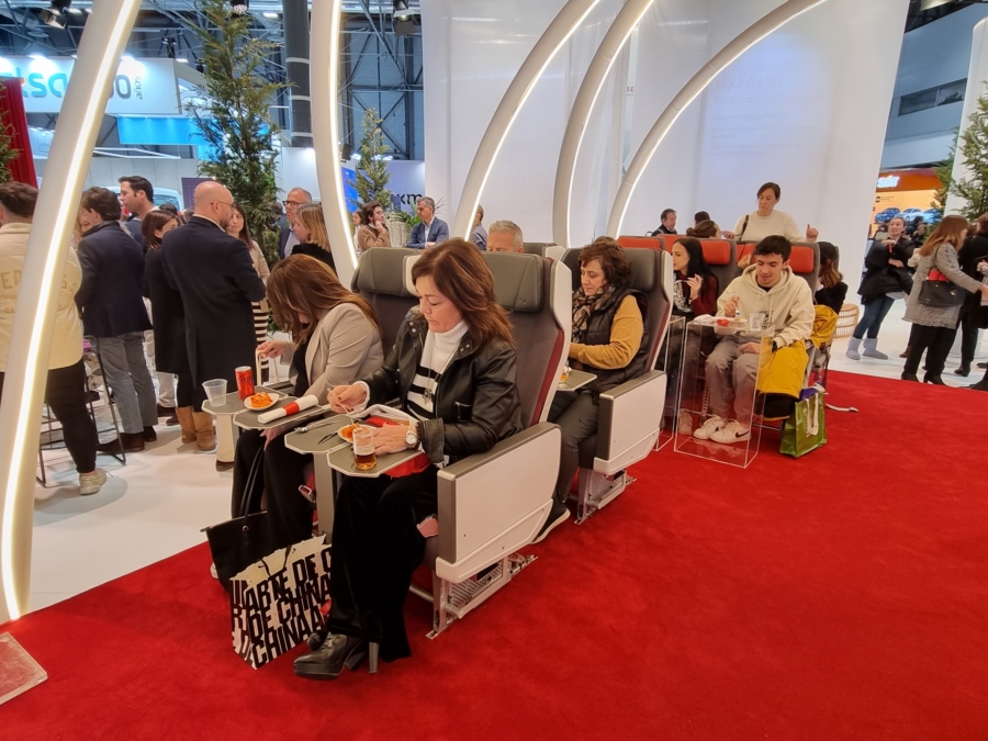 IBERIA. Un año más el stand de Iberia, de 600 metros cuadrados, ha llamado la atención por su diseño y sus propuestas originales. Entre ellas se presenta su nuevo modelo de avión, la flota A350 de nueva generación que incorpora mejoras tanto en la eficiencia operacional como en la comodidad del cliente. Cabinas más anchas, butacas más cómodas, mayor privacidad y un nuevo sistema de entretenimiento con pantallas de 4K, encabezan estas novedades. En el stand los visitantes han podido ver y probar las nuevas butacas de las clases Business, Turista Premium y Turista y saborear una muestra del menú y la atención que se tiene en ellas. También ha sido posible sentirse piloto durante diez minutos y sentarse en el simulador de cabina del A350, despegar el avión desde el aeropuerto de Adolfo Suárez-Madrid Barajas y recorrer a vista de pájaro las principales atracciones turísticas de la capital: desde la plaza de toros de Las Ventas hasta la Puerta del Sol.