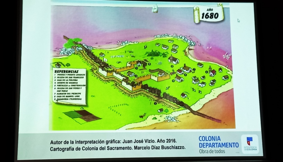 Por su parte, el arquitecto Walter Debenedetti, director de Planeamiento y Patrimonio de la Intendencia de Colonia, cerró el primer tramo de la jornada con su ponencia: “Colonia del Sacramento, patrimonio y sustentabilidad: los desafíos del siglo XXI”. Dio una lección de historia, comenzando con Solís en 1516, para llegar a la fundación en 1680, y con antiguos mapas, ubicó a todos en la época colonial, en la ciudad fortificada, y destacó si vínculo con el agua, tanto en el pasado como en la actualidad. Obviamente habló de arquitectura, de las influencias portuguesas, españolas, patricias, académico, neoclasicista, arte déco y “coloniosa”. También mencionó la relevancia de la gestión, del turismo sustentable, de estrategias de reequilibrio, de rehabilitación, y de la peatonalización a futuro: “las ciudades son libros, que se conocen con los pies”. Asimismo, concluyó que con las nuevas obras y reconstrucciones en el Real de San Carlos, como la Plaza de Toros y el Frontón de Pelota, la ciudad se expandió y se le quitó presión al Barrio Histórico.