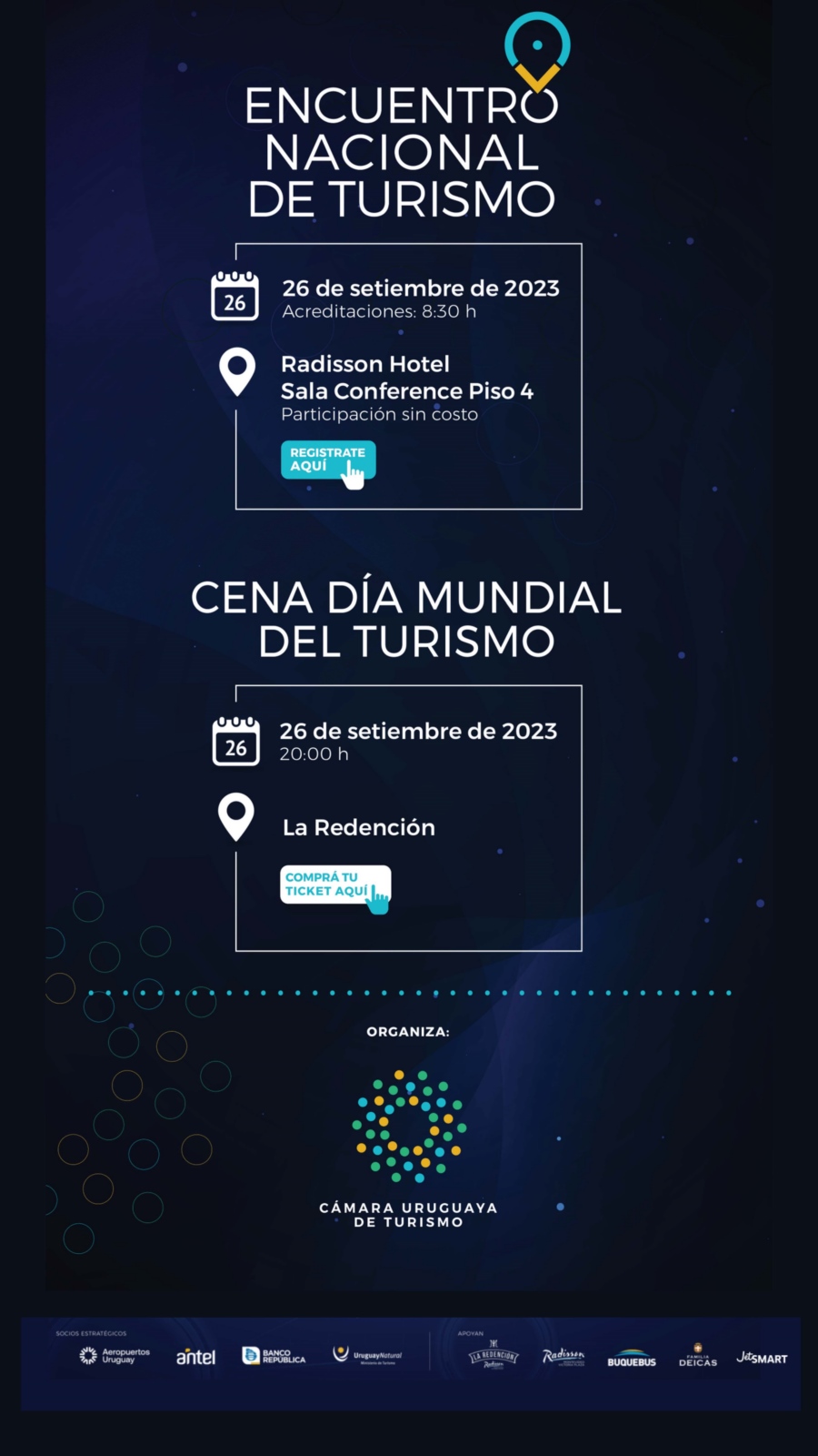 Organiza: Cámara Uruguaya de Turismo. Socios estratégicos: Ministerio de Turismo, Aeropuertos Uruguay, ANTEL y Banco República. Apoyan: La Redención, Radisson Montevideo, Buquebus, Familia Deicas y JetSmart.