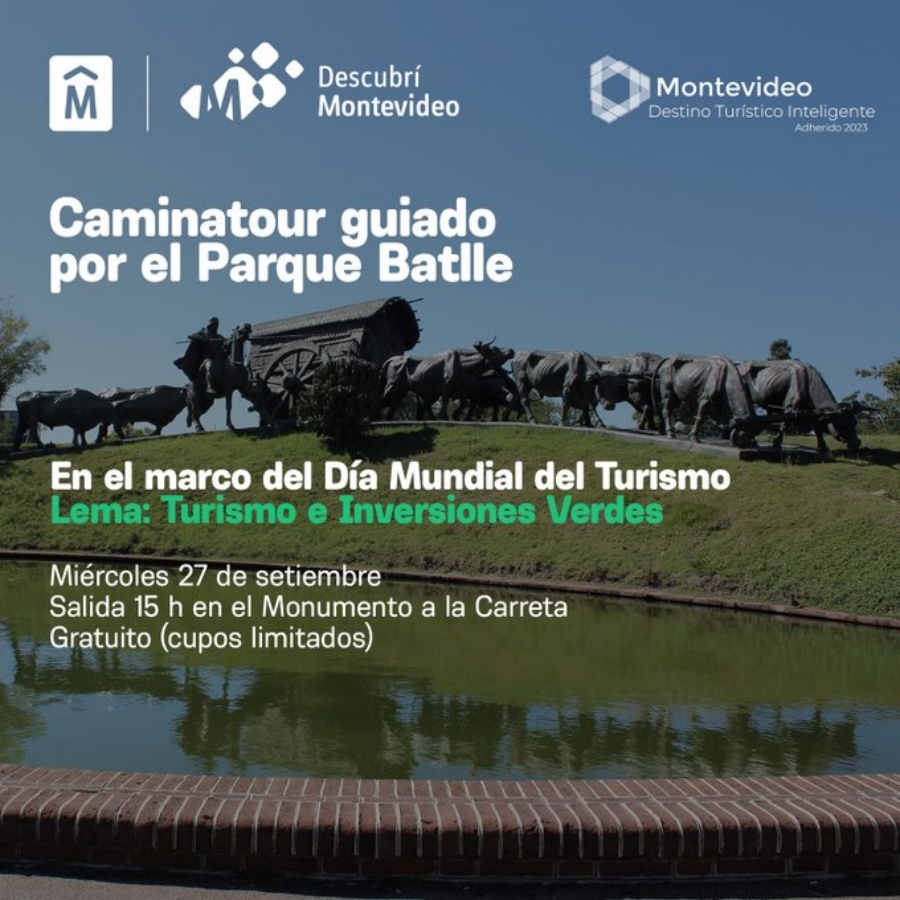 El miércoles 27 de setiembre se realizará un tour temático por Parque Batlle en el marco del Día Mundial del Turismo. El paseo se realizará a pie y se visitará: Parque Batlle, Estadio Centenario (sin ingreso), Velódromo Municipal (sin ingreso), Pista de Atletismo, ISEF, monumentos y fuentes, interpretación de especies nativas y exóticas del entorno. El punto de encuentro del tour será a las 15.00 horas en el Monumento La Carreta. Tendrá una duración aproximada de dos horas. La actividad es gratuita y los cupos son limitados (40), por lo que se debe reservar lugar. Los cupos para la actividad estarán habilitados desde el lunes 25 de setiembre, a la hora 12.00. Por más información, llamar al 1950 9160, de lunes a viernes de 10.00 a 16.00 horas, o escribir un correo electrónico a Esta dirección de correo electrónico está siendo protegida contra los robots de spam. Necesita tener JavaScript habilitado para poder verlo.. Se suspende en caso de lluvia.