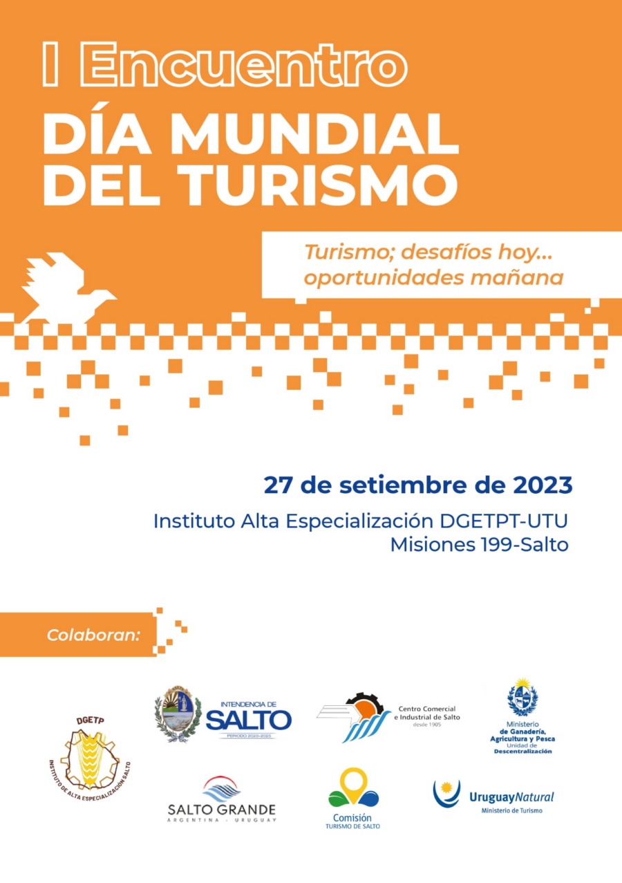 El I Encuentro Día Mundial del Turismo: “Turismo: desafíos hoy… oportunidades mañana”. Organiza el Instituto Alta Especialización DGETPT-UTU, con la colaboración de: Intendencia de Salto, Centro Comercial e Industrial de Salto, Ministerio de Ganadería, Agricultura y Pesca, Salto Grande, Comisión de Turismo de Salto y Ministerio de Turismo.