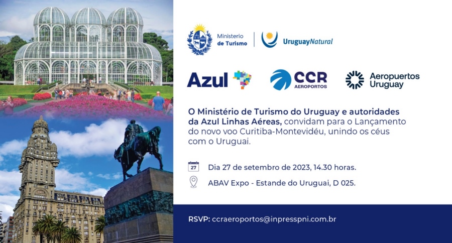 En ese marco, el Ministerio de Turismo de Uruguay y autoridades de Azul Línhas Aéreas, convidan al lanzamiento del nuevo vuelo Curitiba-Montevideo, que tendrá lugar en el stand de Uruguay D025, en la ABAV Expo, el miércoles 27 de septiembre a las 14.30 horas, con el apoyo de CCR Aeroportos y Aeropuertos Uruguay.