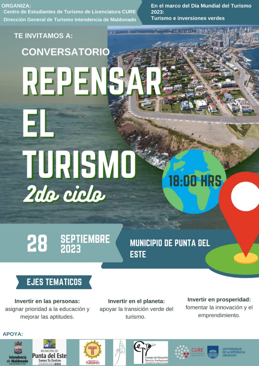 El Centro de Estudiantes de Turismo de Licenciatura CURE y la Dirección General de Turismo de la Intendencia de Maldonado organizan el segundo ciclo del conversatorio “Repensar el Turismo”. Será el jueves 28 de septiembre, a las 18.00 horas, en el Municipio de Punta del Este. Los ejes temáticos son invertir en las personas; invertir en el planeta e invertir en prosperidad. Apoyan: la Intendencia de Maldonado, el Municipio de Punta del Este, Licenciatura de Turismo, Escuela de Alta Gastronomía Dr. Pedro Figari, Centro de Educación Técnico Profesional, Universidad del Trabajo del Uruguay, CURE y Universidad de la República.