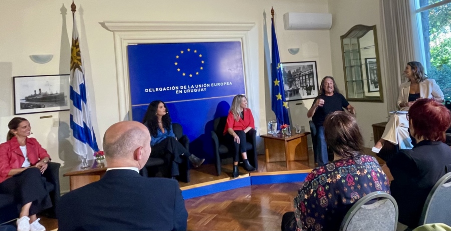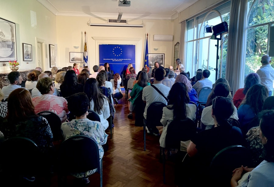 A sala llena se realizó las exposiciones de los artistas invitados bajo la moderación de la periodista Viviana Ruggiero, en la sede de la UE de Montevideo/Uruguay. (foto de autora, 2024)