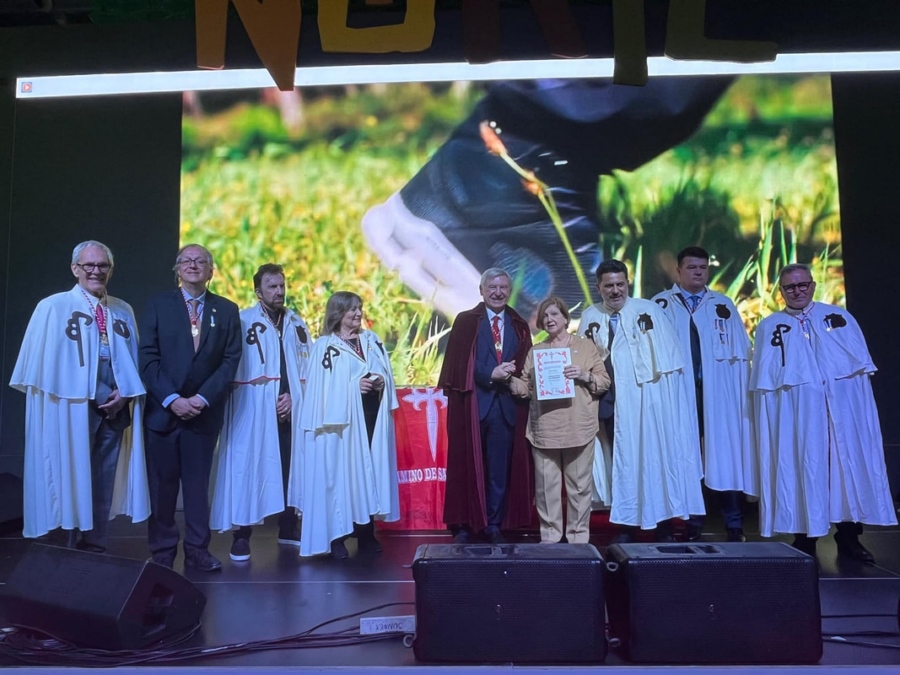 María Shaw, delegada de ASICOTUR en Uruguay, recibe reconocimiento de la Orden del Camino de Santiago de manos del presidente de ASICOTUR, Alejandro Rubin, en la FIT 2023, en Buenos Aires