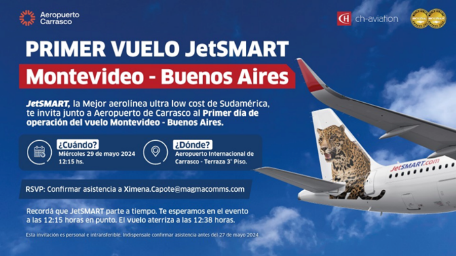 JetSMART y el Aeropuerto de Carrasco invitan al primer día de la operación del vuelo Montevideo-Buenos Aires, el miércoles 29 de mayo, a las 12.15 horas, en el tercer nivel del Aeropuerto.