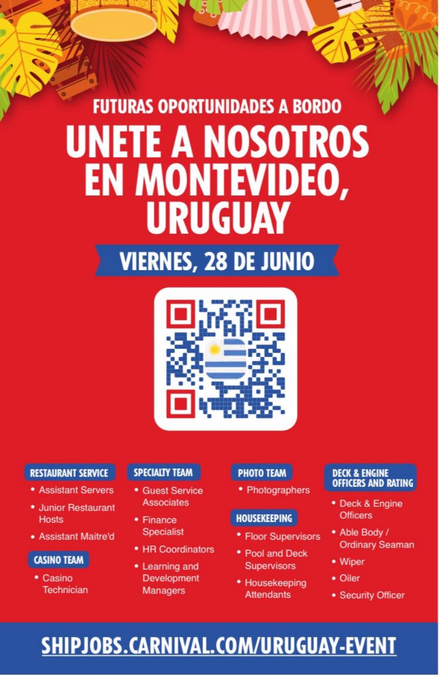 Carnival Cruise Line, parte de Carnival Corporation & plc, el grupo de cruceros más grande del mundo, ha elegido Uruguay para presentar diversas oportunidades laborales. Este evento busca aportar valor compartido a los destinos que visitan anualmente y reconocer el talento uruguayo, incorporando a su equipo diverso de más de 48.000 miembros de más de 100 nacionalidades.